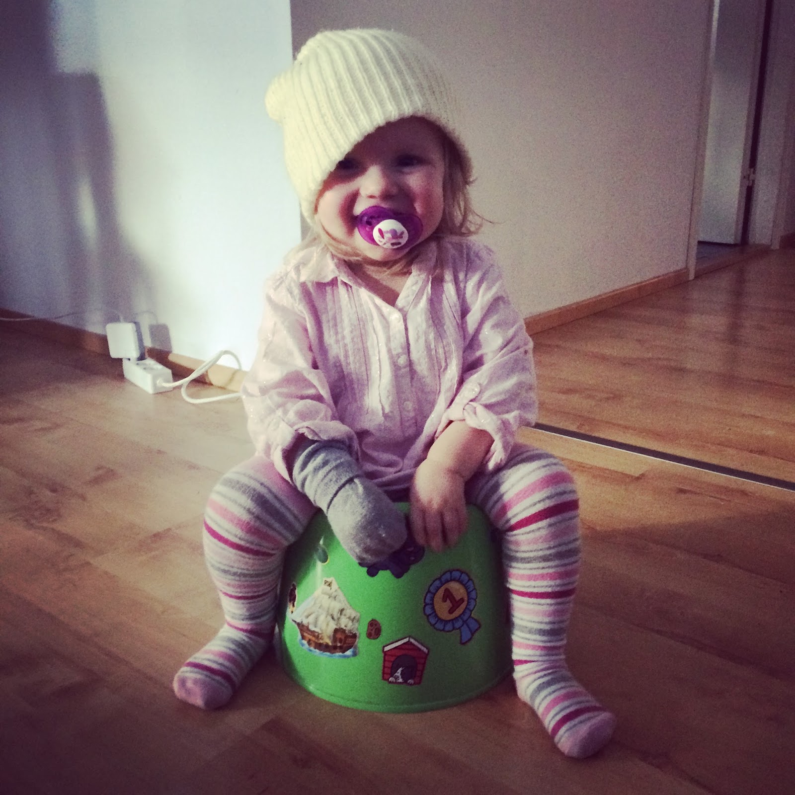 Tämän päivän ohjelmaan ei ole kuulunut kaupassakäyntiä kummempaa, ja lapset ovat saaneet keksiä itse tekemistä viihtyäkseen. Tämä pienin tuttisuu lienee taitavin siinä hommassa, ja vaikka räpsäisin nämä kuvat eilen, on meno ollut ihan samanlaista tänäänkin. Potan kanssa mennä suhataan milloin mikäkin päässä, kädessä tai jalassa, mutta kaikista kivointa on tiputtaa äidin vaatehyllystä pino lattialle, ja valkata sieltä kaikkein värikkäin paita kaulaliinaksi. Joskus vaikkapa ihan vaan silmien peitteeksi niin, että voi kivasti kävellä suoraan päin seinää pienen jännityksen puutteessa. Ikean mammut jakkaraa tykkää kuskata myös mukanaan ja sopivan paikan tullen kiivetä sen avulla keittiön pöytää tonkimaan ja sitärataa. Tässä saa kyllä olla aivan jatkuvasti silmä tarkkana, että tuon ipanan saa pidettyä hengissä. Ihana ja kiltti se on, mutta ehtiväinen!